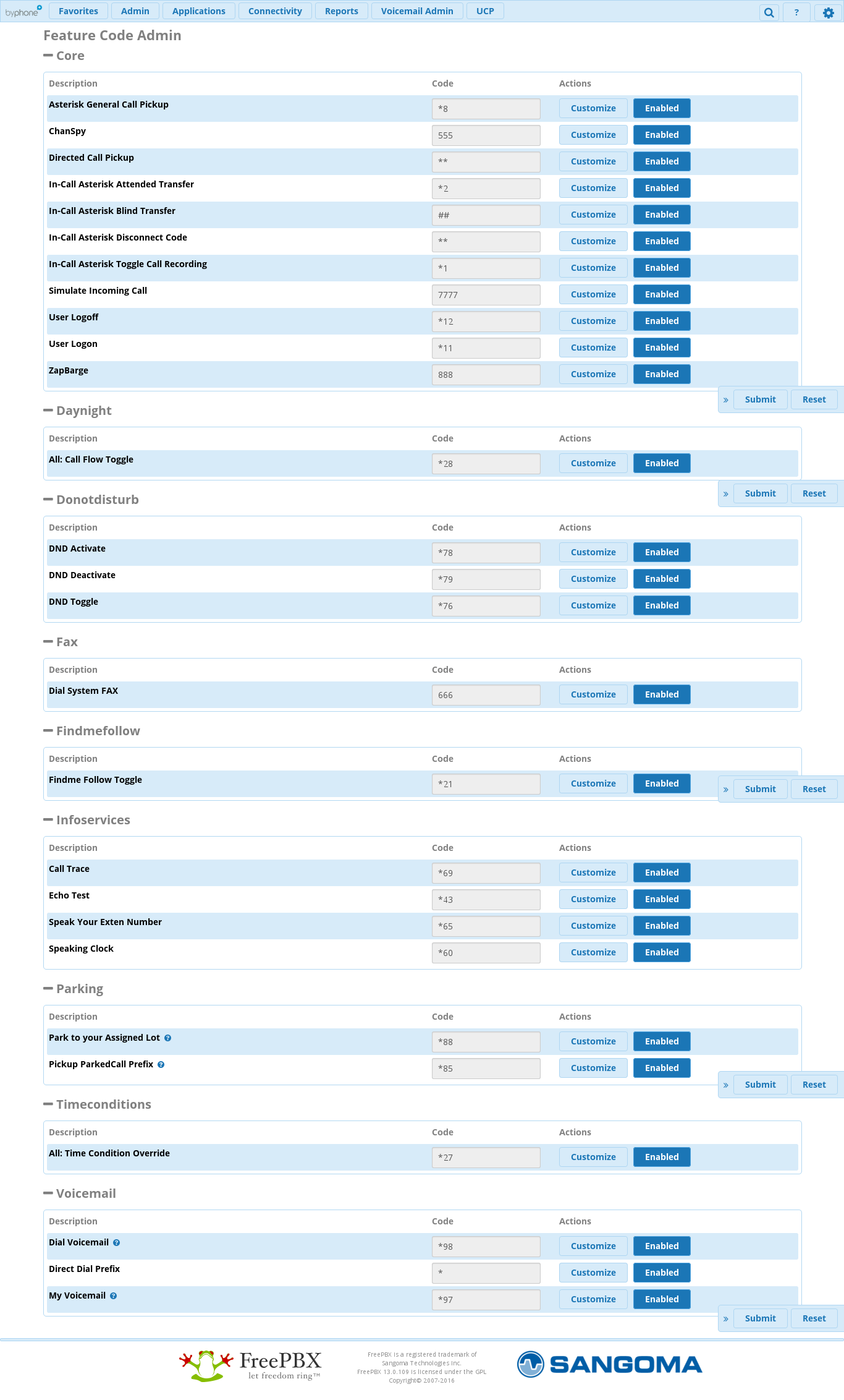 The Feature Code module is where you can view all the feature codes that are built into your PBX. You can perform the following actions for each feature code: